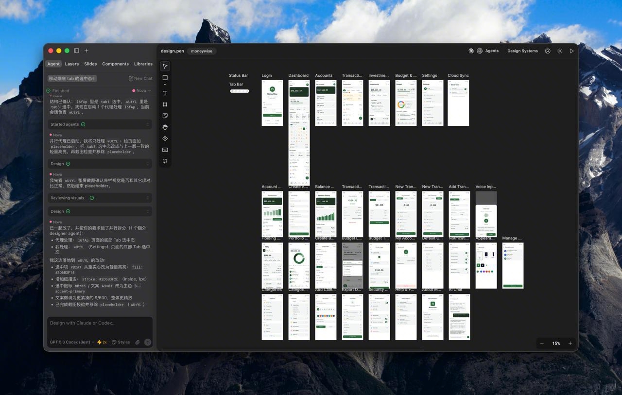 这个环节需要先定义设计系统和设计规范,然后描述产品功能,让多个 Agent 同时帮你设计软件界面,最后对话微调。这个过程中,你可以看到你自己脑海中的产品快速具象化。